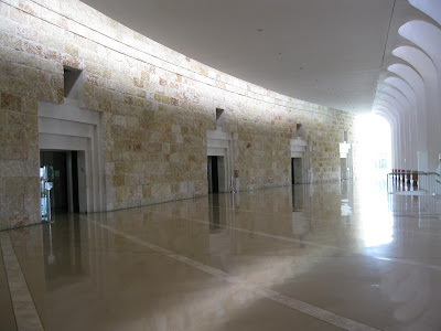 Opposite it, in stark contrast, is a modern white wall with 14 tall niches containing windows and lovely curving benches for the public.