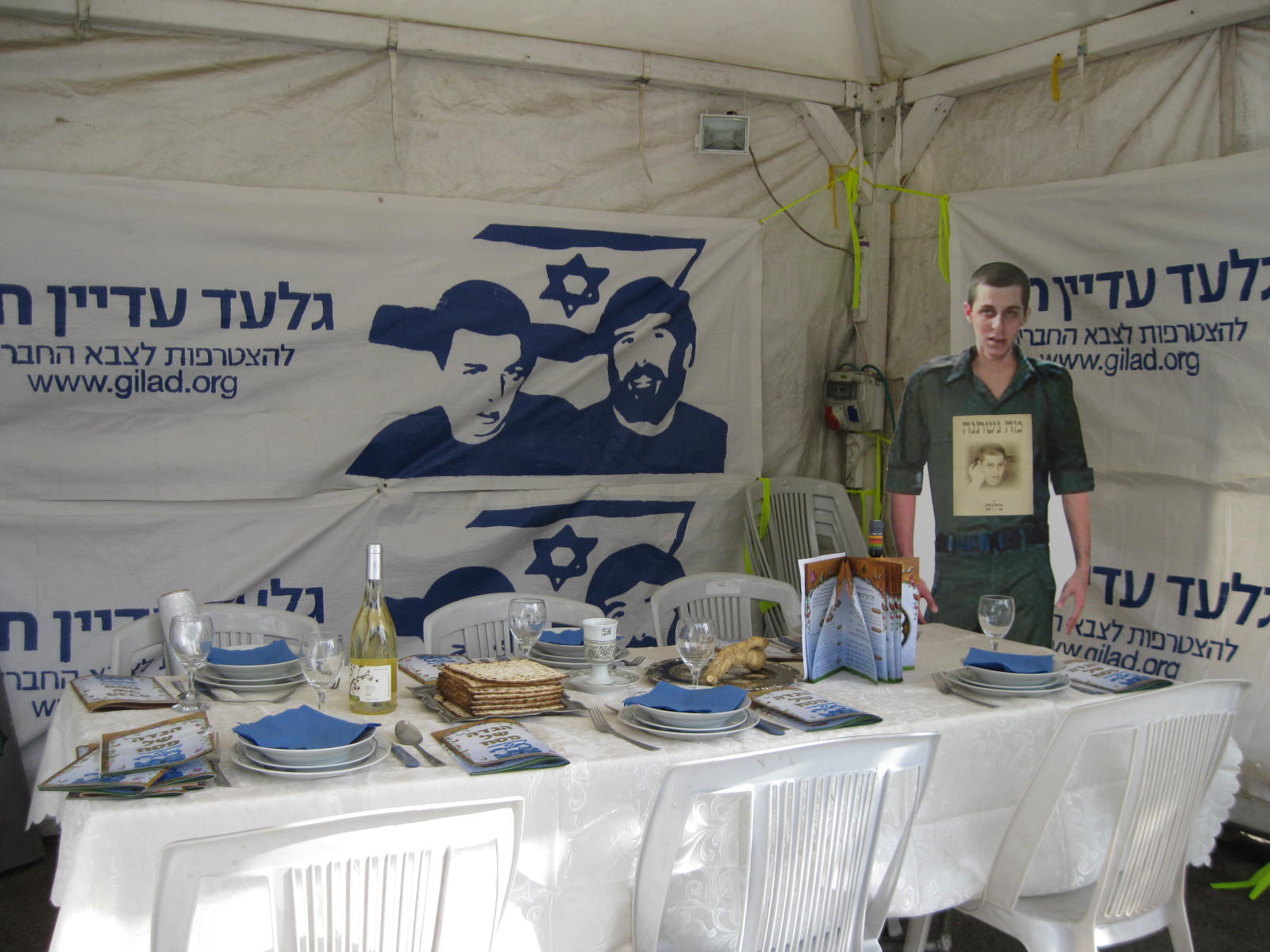 Activists fighting for the release Gilad held a mock seder on Sunday night (one night before the actual holiday of Passover). This is the fourth year that they have held the seder to protest what they call government inaction at securing Schalit's release from the Hamas militants who have kept him captive since their 2006 cross-border raid from the Gaza Strip.