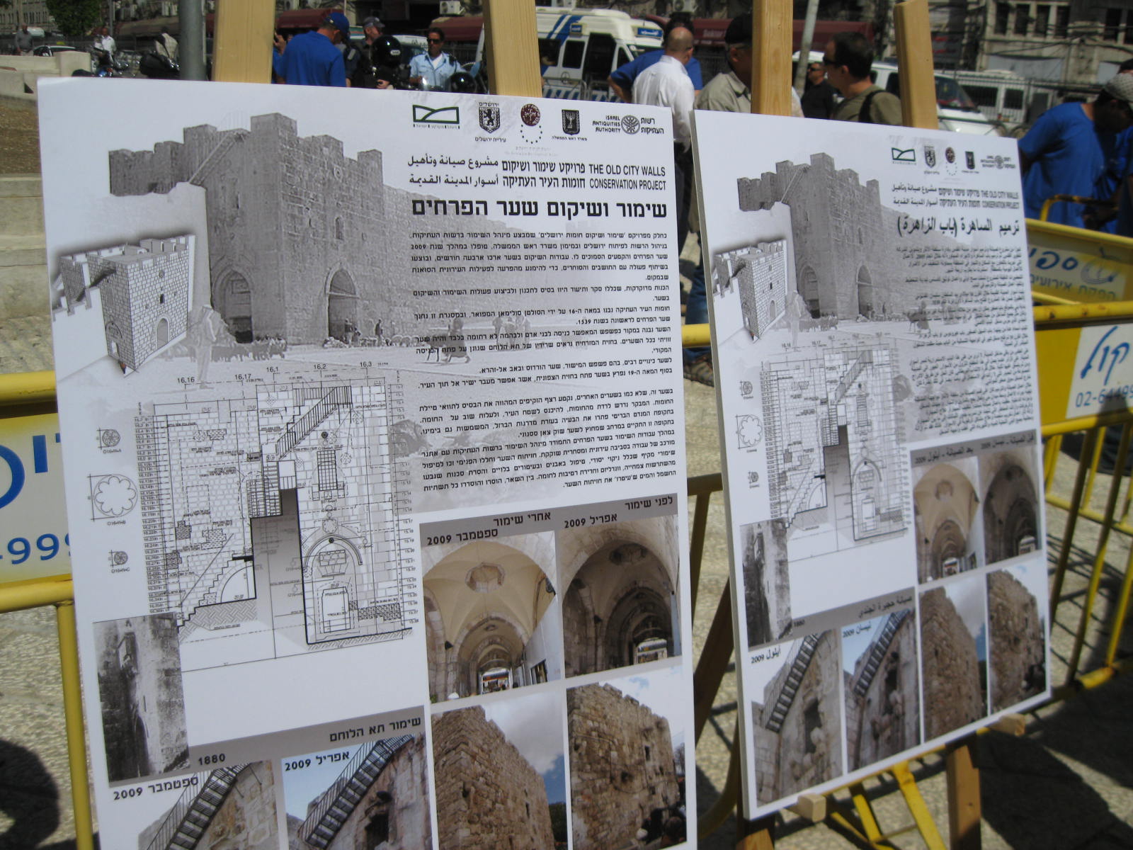 The posters in Hebrew and Arabic show the before and after and the work plans.