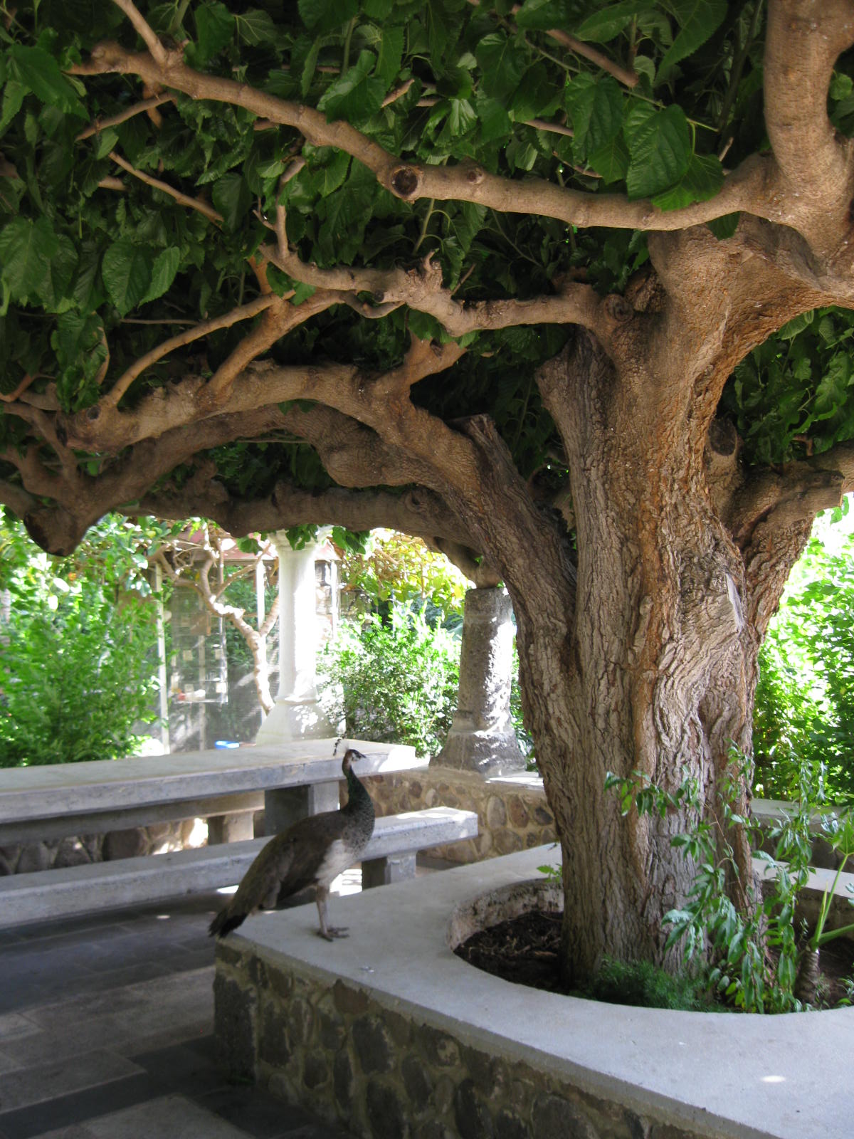 With the temps you're having, I'd be under that table myself. The tree is gorgeous... even more so than the pretty peacock! And probably as old as the hills there... Beautiful shot of the church against that relentlessly blue sky, Dina.