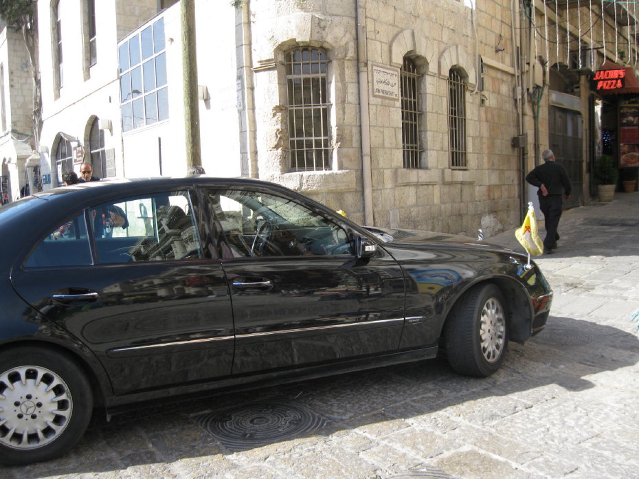 The squeaky clean windows and body of the Mercedes reflect* the Old City buildings in Omar Ibn Al-Khattab Square.The diplomatic corps car was turning into the narrow Latin Patriarchate Road.