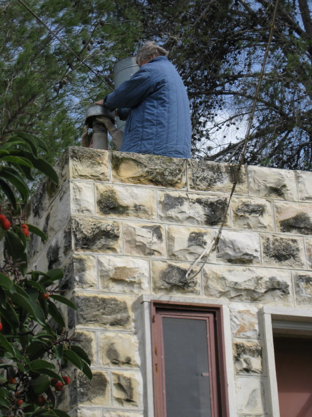 Then I remembered a little place with an old wood-burning heating stove, and I recalled a cold and windy day last January when I took this picture:Two women up on the roof trying to repair the old chimney so that smoke would go up and out while keeping the rain from dripping down into the room!