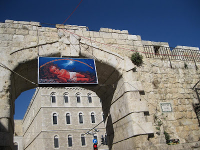 So for you, gentle readers, I made a trip into Jerusalem today and walked through the Christian Quarter of the Old City in search of red and green of the season.