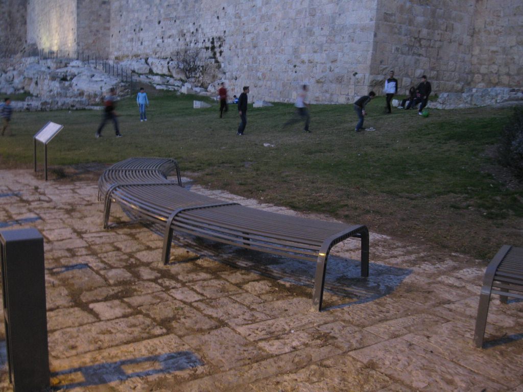At the base of the ramparts Arab boys were kicking a ball around on what's left of the green grass in Gan Habonim park.