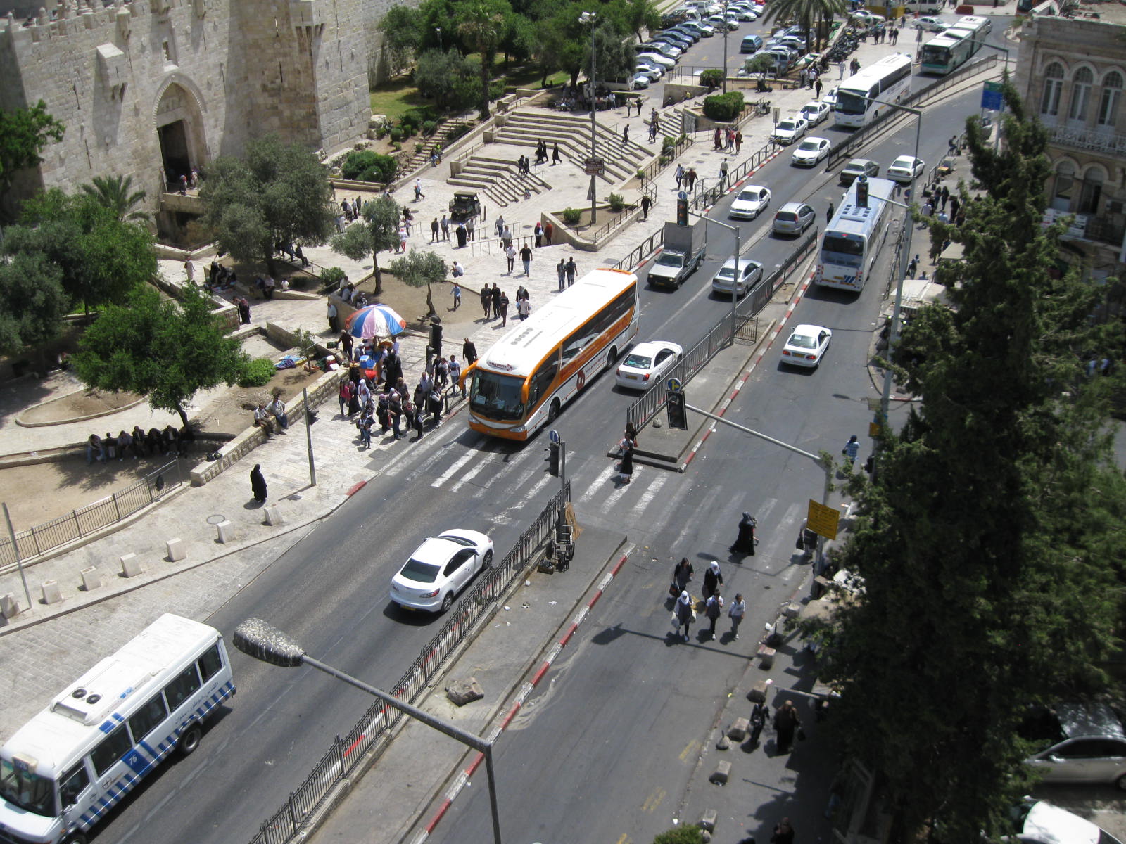 The east Jerusalem Arab bus terminal is nearby; the small blue and white bus is one of many that go to Bethlehem and back all the time.
