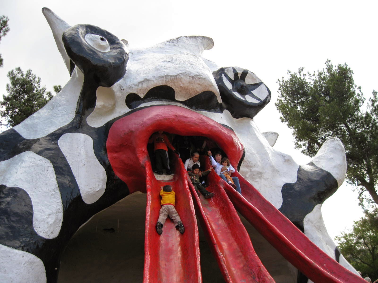 That is quite a monster with his mismatched googly eyes and three tongues spewing assorted children! But lots of fun too, once you get used to the steep incline.