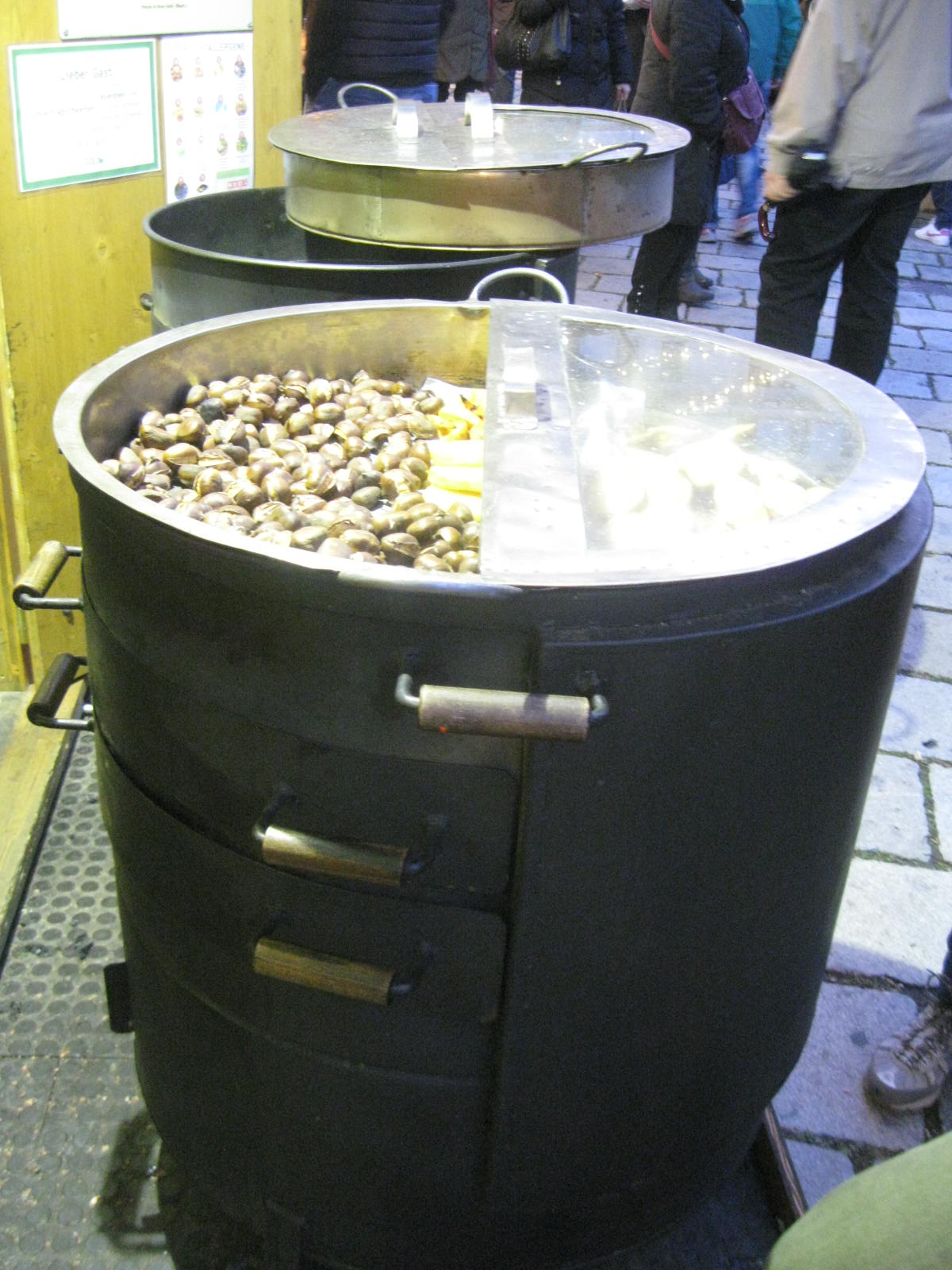 The yellow wheel of this steam engine (?) was turning, I guess helping to roast the Maroni, the chestnuts.