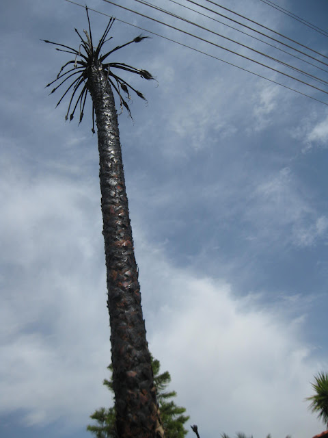 The now leafless and blackened dead palm will hopefully be cut down soon.